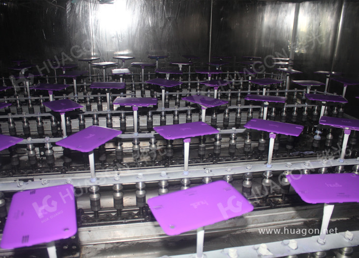 上料-手動靜電除塵-素材預熱-自動靜電除塵-自動底漆噴涂-表干-自動面漆噴涂-靜置-烘烤-冷卻-下料